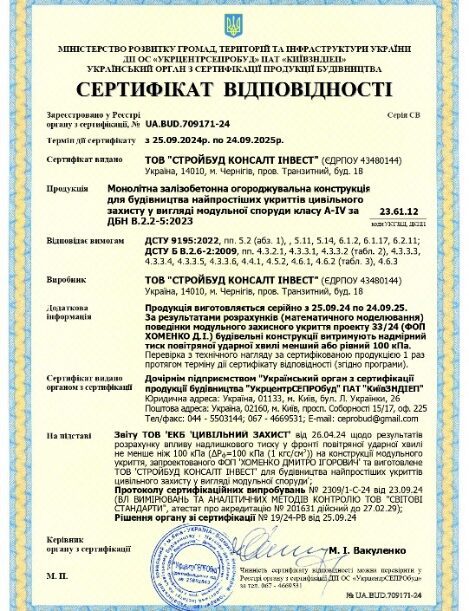 Наша продукція сертифікована має сертифікат відповідності (сертифікат випробувань), відповідає класу А-IV за ДБН В.2.2-5:2023 та ДСТУ 9195:2022 «ШВИДКОСПОРУДЖУВАНІ ЗАХИСНІ СПОРУДИ ЦИВІЛЬНОГО ЗАХИСТУ МОДУЛЬНОГО ТИПУ».