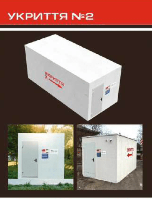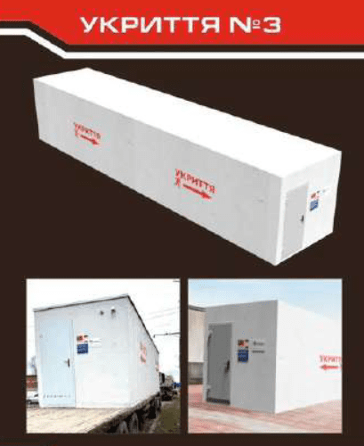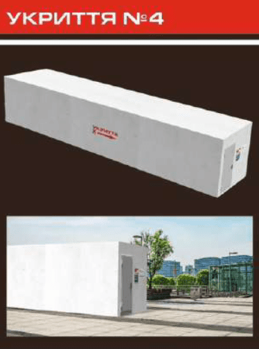 Повністю монолітні залізобетонні конструкції, які забезпечують безпеку при суттєвій вибуховій хвилі від КАБів та ракет (не з окремих бетонних блоків, що можуть бути розчавлені вибуховою хвилею чи попаданням снаряду). Конструкції можуть бути розраховані на різну кількість людей (від 15 до 100 осіб). Товщина стін 20 см, монолітно залитий бетон + укріплена (армована) арматура ⌀ 16 та ⌀ 12 мм. Вага конструкції складає від 25,00 нетто-тонн (залежно від кількості людей на яке розраховане укриття).