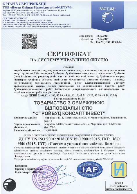 - Сертифікат на систему управління якістю (виданий ОРГАН З СЕРТИФІКАЦІЇ ТОВ “Центр Оцінки Відповідності “ФАКТУМ”, дата видачі: 18.12.2024 № UA.MQ.241118.01-24) відповідає вимогам ДСТУ EN ISO 9001:2018 (EN ISO 9001:2015, IDT; ISO 9001:2015, IDT) “Системи управління якістю. Вимоги”