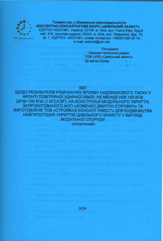 - Звіт щодо результатів розрахунку впливу надлишкового тиску (Погоджено Науково-технічною радою ТОВ “УКБ “Цивільний захист” 26.04.2024).