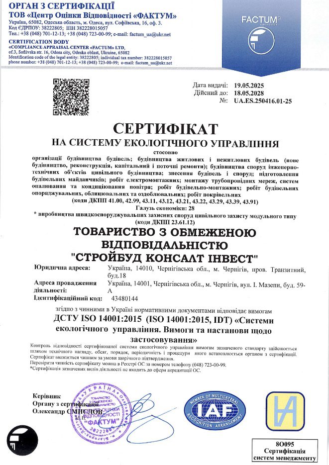 - Сертифікат на систему екологічного управління (виданий ОРГАН З СЕРТИФІКАЦІЇ ТОВ “Центр Оцінки Відповідності “ФАКТУМ”, дата видачі: 19.05.2025 № UA.